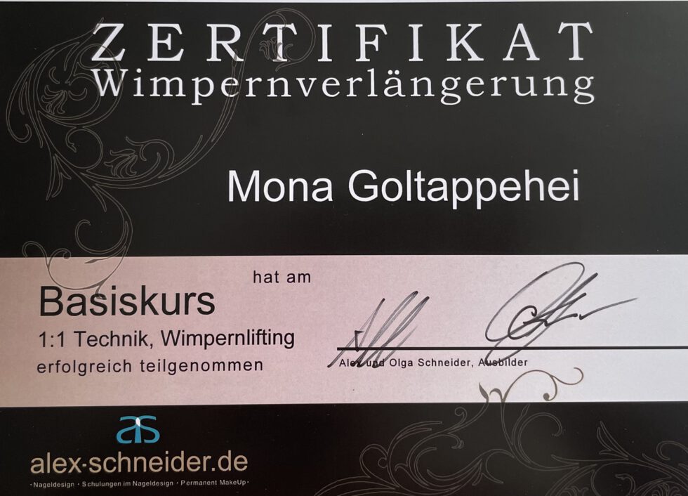 Da wirklich alles was mit Beauty zu tun hat, meine große Leidenschaft ist, haben sich über die Jahre natürlich ein paar Zertifikate angesammelt. Du bist herzlich eingeladen Dich durch meine Zertifikate-Galerie zu klicken, um Dir einen Überblick über meine Fähigkeiten zu verschaffen.
